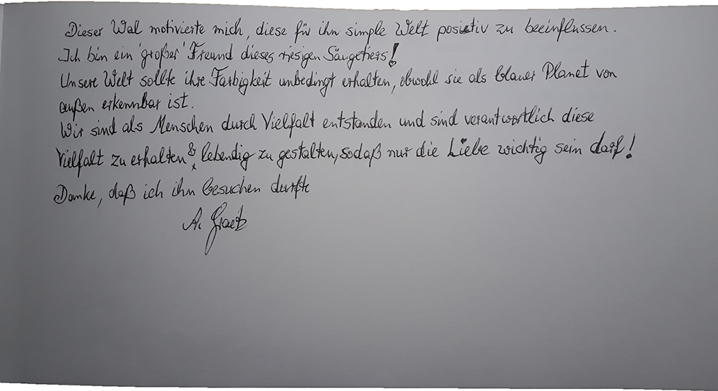 Im Außenbereich ist ein Fahrradgenerator fest installiert, mit dem die Gäste strappelnder Weise Energiespenden leisten können, um den Denk-Wal „am Leben“ zu halten.